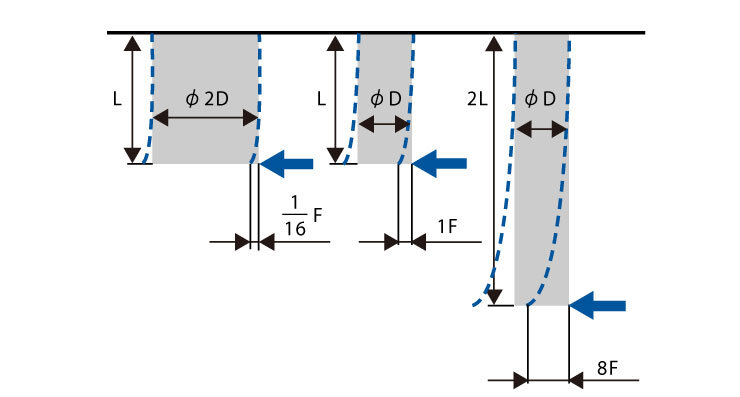 例えば図のように、同じ突出し長さLにおいて、工具径Dを2倍にできれば、理論上は2の4乗、すなわちなんと16倍(!)のたわみにくさが得られ、加工面が傾いて仕上がってしまうのを防ぐのに有効です。