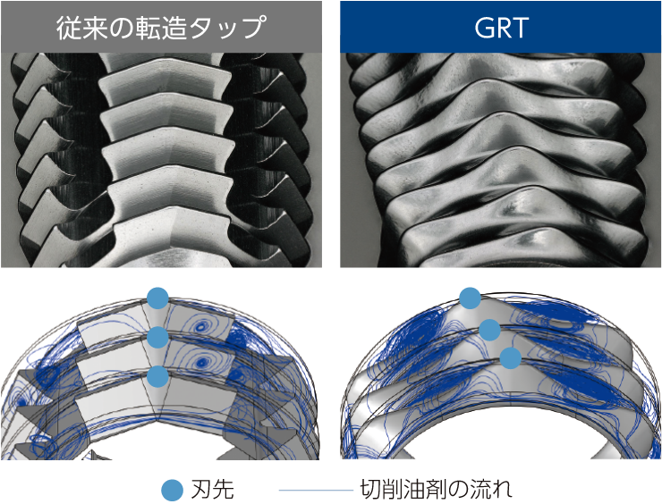 その結果、オーエスジー独自の特殊ねじ山仕様により、崩れの少ない良好なめねじ山を形成しています。それがこのGRTの独特な形状の理由です。