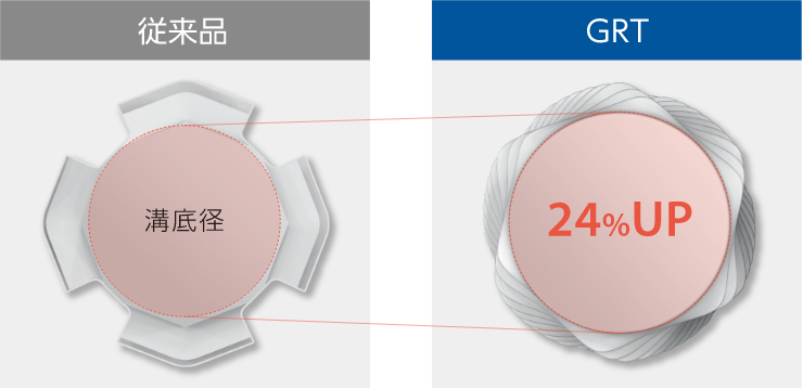 転造タップは切削タップより大きな加工負荷がかかり、無理な加工条件では折れてしまう可能性もあります。折れたタップを取り除くのは手間でお客様に負担をかけてしまいます。そこで、GRTは油溝を無くしたうえ、さらに断面積を大きくした結果、耐折損性が著しく向上しました。GRTは、ばらつきの無い高い耐久性を実現します。