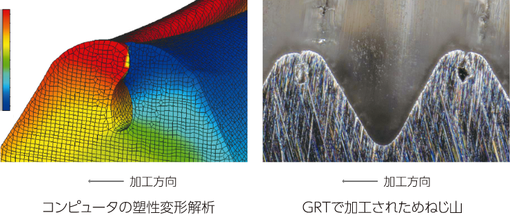 GRTの形状はコンピュータの塑性変形解析を用いたシミュレーションを基に設計されています。数値解析によって導き出される最も合理的な形状を追求し、転造タップの理想形状とは何かという命題の答えを見つけ、実現することができました。