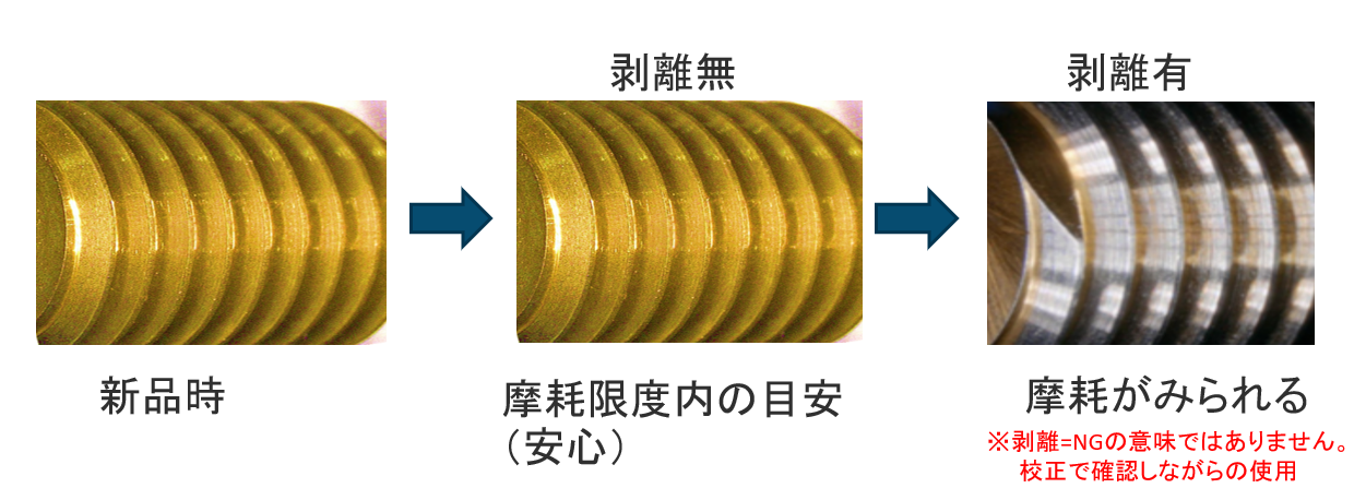 こちらも玉手箱にも記載がありましたが、「摩耗が目で確認できる」のが最大の特長のゲージでございます。摩耗点検ねじゲージで確認しなくとも、摩耗が一目瞭然でしたらどうでしょう?安心ですよね?以下、その様子と精度設定のイメージ画像でございます。TiNコーティングねじ用限界ゲージは摩耗が目で見えるだけでなく、高硬度なTiN被膜により耐久性も著しく向上いたします。ご使用環境に依るお話ではございますが、「従来のゲージの5倍以上長く使えた」というお客様の声もございます。また、コーティング被膜により錆びにくいという特性もございます。(注:全く錆びないという訳ではございません)