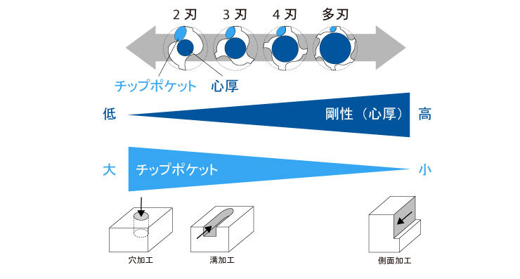 まず、立ち壁加工においては刃数はできる限り多い方が有利です。なぜなら、図の通りエンドミルは刃数が増すほど心厚が厚くなることで剛性が高まり、たわみにくい特性があるからです。反面、刃数の多いエンドミルはチップポケットが狭くなるため、穴加工や溝加工には不向きとなります。