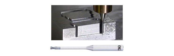 一方、深い溝加工における代表例としては「リブ溝」があります。「リブ溝」は、主に薄肉の製品筐体を補強する目的で設けられる内部構造であり、成型用金型などに用いられています。概して小径エンドミルによる深い溝加工が必要とされます。こうした場面でのエンドミル選定は、刃長自体は短く、刃径より細い「首」を長く備えたロングネック仕様が有効です。細分化された首長さバリエーションの中から、加工する溝深さに応じた最適な長さを選び、パス回数を何度も重ねながら徐々に深く溝を削り出す使い方をします。