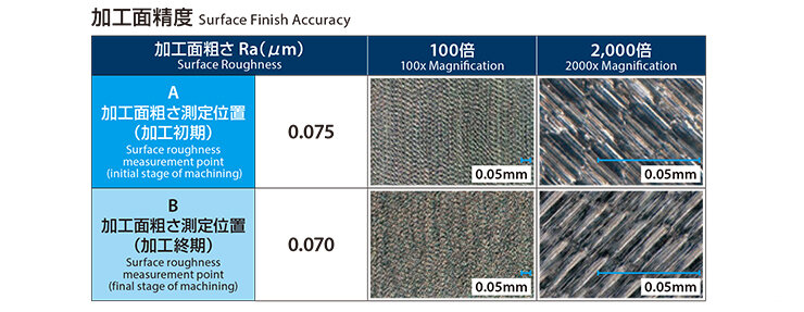 最大の特徴は、独自の「マイクロレリーフ」形状にございます。これにより、ボールR部の形状変化を最小限に抑え、高品位な加工を長時間持続させることが可能となりました。3. 徹底した高精度仕様