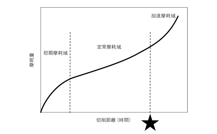 ★印が切れ刃としての性能が発揮できる限界、すなわち寿命にあたりますので、これを超える前に工具交換、あるいは再研磨すべきといえます。