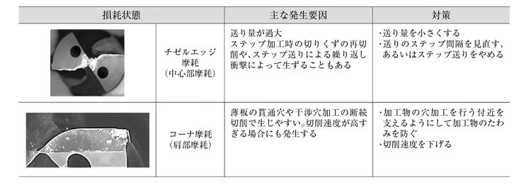「適切に使われた」ドリルの摩耗進行は「逃げ面摩耗」が主です。数値的にもその摩耗幅がハイスなら0.5mm、超硬なら0.3mm程度といった寿命目安があります。