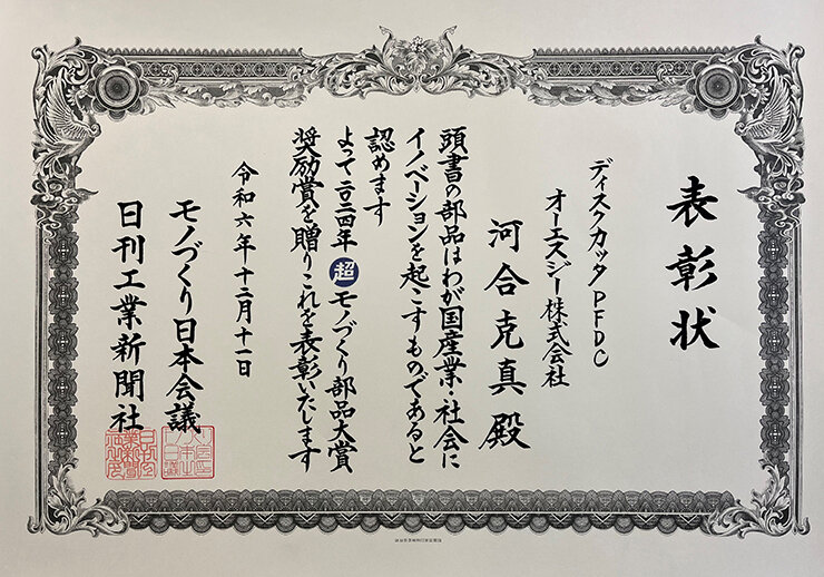 OSG PHOENIXディスクカッタPFDCが「2024年"超"モノづくり部品大賞」(主催:モノづくり日本会議/日刊工業新聞社)の奨励賞を受賞しました。
