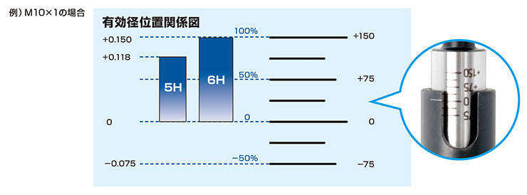 めねじ口元部有効径の数値化により、工具交換後のめねじ有効径をほぼ同じにそろえる事ができます。スタート位置を同じにすることで、ゴール位置(工具寿命)もそろえる事が可能となり、工具寿命の安定化を実現します。