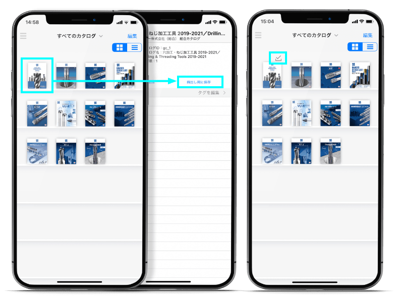 「Myカタログ」に登録したカタログの表紙を長押しし、「持出し用に保存」ボタンをタップするとオフライン環境でも閲覧ができます。